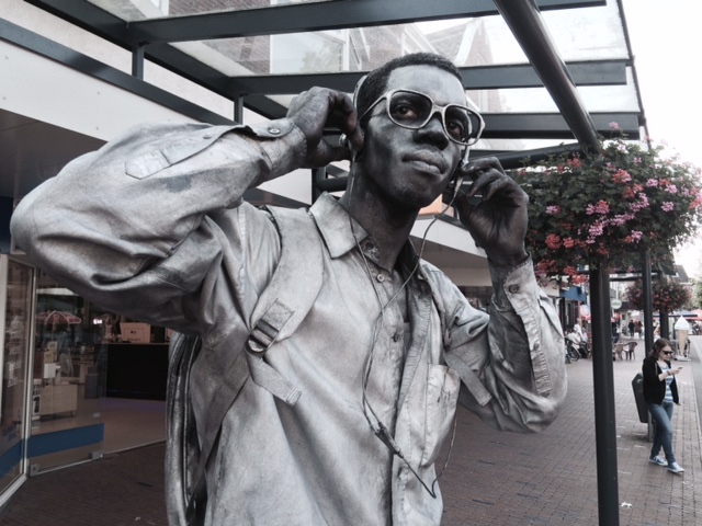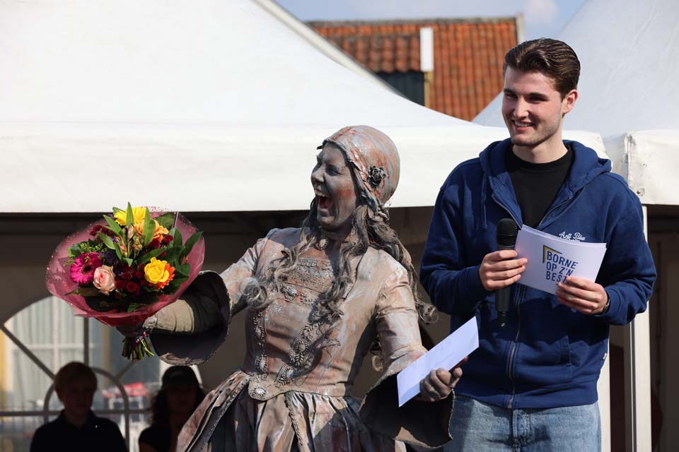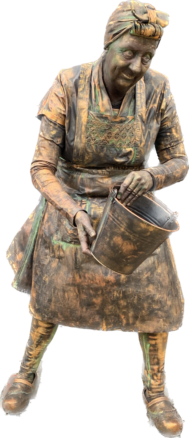 Levend standbeeld met hond, herkenbaar straatbeeld.